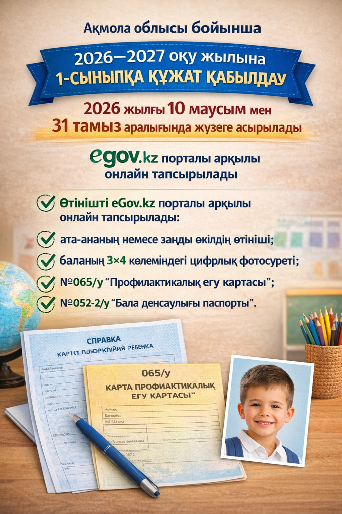 2026–2027 оқу жылына 1-сыныпқа құжат қабылдау Ақмола облысы бойынша  2026 жылғы 10 маусым мен 31 тамыз аралығында жүзеге асырылады. Өтінішті eGov.kz порталы арқылы онлайн тапсырылады.